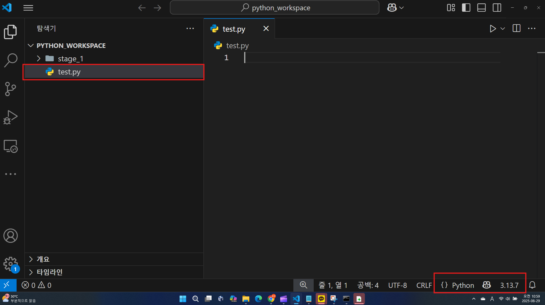 새로운 파일을 생성해서 보면 우측 하단에 파이썬과 버전을 확인 할 수 있습니다.