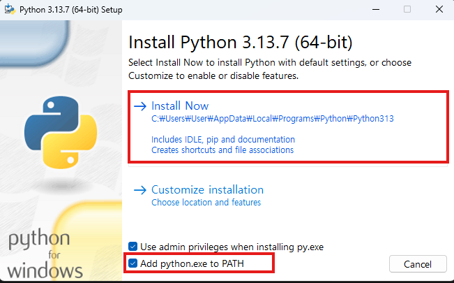 "add python.exe PATH" 체크 꼭 해줘야 편리합니다.